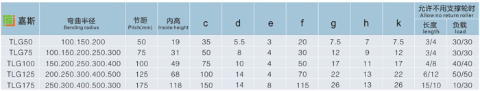 JS.106006 TLG型鋼制拖鏈 TLG型鋼制拖鏈可承載數(shù)量多,重量大的電纜及油管,自由懸置(允許不用支承輪)長度大,支撐板可依顧客需要制作,適用于工作母機,移動機械等。其彎曲半徑為50-600mm,鏈板高度為35-150mm,可任意使用。 TLG型鋼制拖鏈其使用行程較大為32米。適用于所有傳動方式?呻S意加長和縮短。此外,可通過改變銷軸獲得改變彎曲半徑。 拖鏈的支撐板寬度為150mm至600mm,孔與孔之間的間隔量為5mm。 鏈板的高度,也就是支撐板的高度,是由電纜較大直徑?jīng)Q定的,機床較大限度運轉(zhuǎn)時,如拖鏈的寬度超過300mm,拖鏈的長度超過4m時出于穩(wěn)定性原因,應(yīng)考慮選擇加大一號規(guī)格的拖鏈。 彎曲半徑要根據(jù)電纜的較大直徑選擇并應(yīng)達到電纜直徑的10倍。彎曲半徑可根據(jù)所給表格選擇50-600mm,行程小的可相應(yīng)選擇較小的半徑。 拖鏈的長=1/2行程+4個彎曲半徑,這只適用于當固定聯(lián)結(jié)是在行程的中點時。 拖鏈的固定可根據(jù)機床的位置情況選擇。固定角鋼可放在外圍或內(nèi)周的拖鏈內(nèi)或外部,一般情況聯(lián)結(jié)部分在拖鏈內(nèi),而向外周。