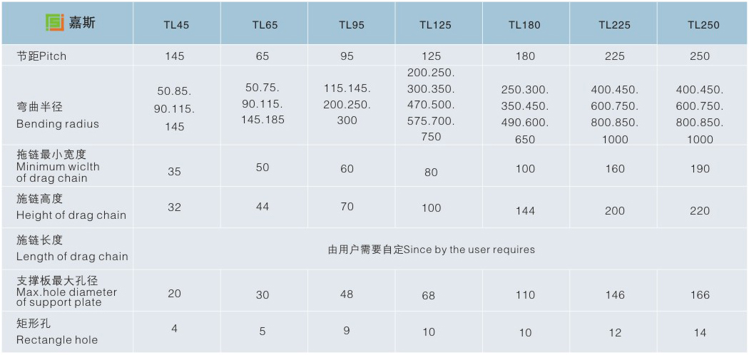 Tl series of the main body of drag chain is made up of chain plate (high quality chrome plated steel) support plate (pultrusion aluminum alloy) shaft pin (alloy) components, such as cable or do not produce relative motion between rubber hose with drag chain, does not produce distortion, chain plate after chrome plating treatment effect of the novel appearance, reasonable structure, smart not deformation, rigidity and high strength features easy installation, use and reliable, easy to tear open outfit, especially this product USES the high strength wear resistant material, copper alloy as the shaft pin, improve the wear resistance strength, bend more flexible, less resistance, reduces the noise, which can guarantee the long time use without deformation, or not. Because this product appearance elegant, can in a large extent, enhance the artistic appearance overall effect of machine tool equipment, enhance our machine tools, machinery and equipment in the international market competition ability. 1. Drag chain can adapt to the maximum speed of 40 m/min. 2. Drag chain when maximum speed, noise sound pressure level is not more than 68 decibels. 3. Drag chain security service life not less than 1 million times (reciprocating).